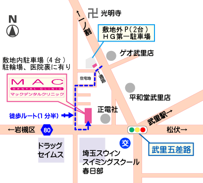 埼玉スウィンスイミングスクール春日部さんの向かいにある「マックデンタルクリニック」では、皆様がリラックスして診療を受けていただけるよう心がけ、優しく診療しております。